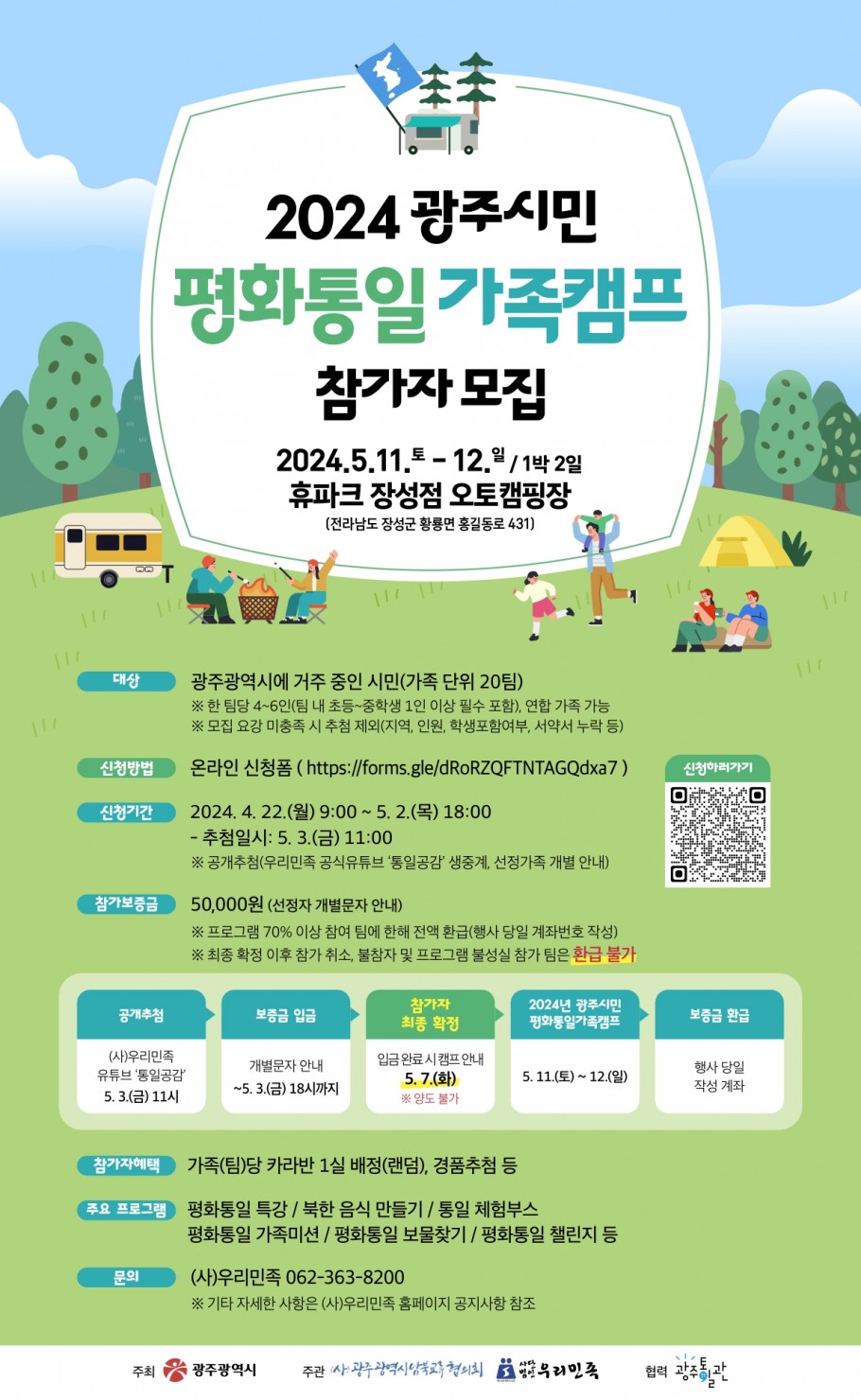 ½Åû¾È³» ¢º ´ë»ó - °¡Á·´ÜÀ§ 20ÆÀ - ±¤ÁÖ±¤¿ª½Ã¿¡ °ÅÁÖÇϰí ÀÖ´Â ½Ã¹Î - ÇÑ ÆÀ´ç 4~6ÀÎ, ÆÀ ³» Ãʵî~ÁßÇлý 1ÀÎ ÀÌ»ó Çʼö Æ÷ÇÔ, ¿¬ÇÕ °¡Á· °¡´É - ¸ðÁý ¿ä° ¹ÌÃæÁ· ½Ã Ãß÷ Á¦¿Ü(Áö¿ª, Àοø, ÇлýÆ÷ÇÔ¿©ºÎ, ¼¾à¼ ´©¶ô µî) ¢º ½Åû¹æ¹ý: ¿Â¶óÀÎ ±¸±ÛÆû( https://forms.gle/dRoRZQFTNTAGQdxa7 ) ¢º ½Åû±â°£: 2024³â 4¿ù 22ÀÏ(¿ù) 9:00 ~ 5¿ù 2ÀÏ(¸ñ) 18:00 ¢º Ãß÷: 5¿ù 3ÀÏ(±Ý) 11:00 - °ø°³Ãß÷ : (»ç)¿ì¸®¹ÎÁ· °ø½ÄÀ¯Æ©ºê 'ÅëÀϰø°¨' »ýÁß°è, ¼±Á¤°¡Á· °³º° ¾È³» ¢º Âü°¡º¸Áõ±Ý 50,000¿ø(¼±Á¤ÀÚ °³º° ¹®ÀÚ ¾È³») *ÀÚ¼¼ÇÑ ³»¿ëÀº Æ÷½ºÅÍ Âü°í ¢º ¹®ÀÇ : (»ç)¿ì¸®¹ÎÁ· 062-363-8200